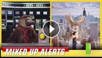 Jackie, the weather reporting jackalope, reports clear skies to Platy the platypus back at the news station. So, of course, Platy takes it upon himself to mix things up by launching Jackie into the sky with a helium-filled balloon using the Lunchables Mix It Up Button. According to Jackie, the views apparently do get better.